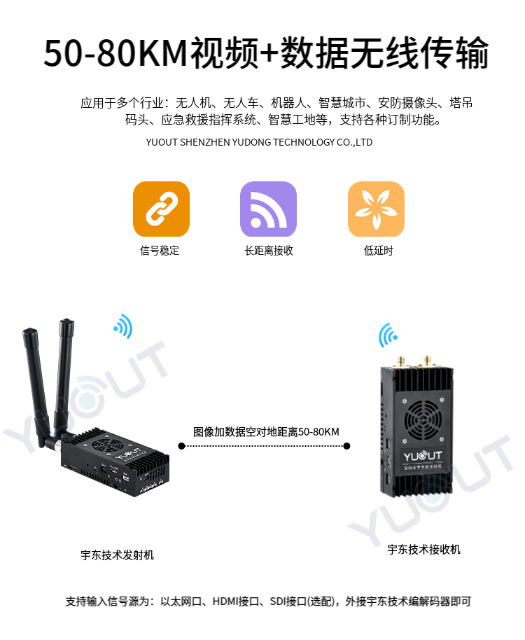 YD-TS0080-WK是圖數(shù)一體無(wú)線發(fā)射機(jī),內(nèi)置雙向OFDM無(wú)線鏈路,支持單向無(wú)線視頻發(fā)射、雙向無(wú)線語(yǔ)音傳輸、雙向無(wú)線網(wǎng)絡(luò)透?jìng)?、雙向無(wú)線串口透?jìng)鳌? 1路HDMI高清+1路AV標(biāo)清(兼容AHD)音視頻H265編碼OFDM無(wú)線發(fā)射 1路雙向無(wú)線透?jìng)饕蕴W(wǎng)口、2路雙向無(wú)線透?jìng)鱎S232串口 1個(gè)RS232配參串口 1路音頻輸出,可直接接1W的揚(yáng)聲器