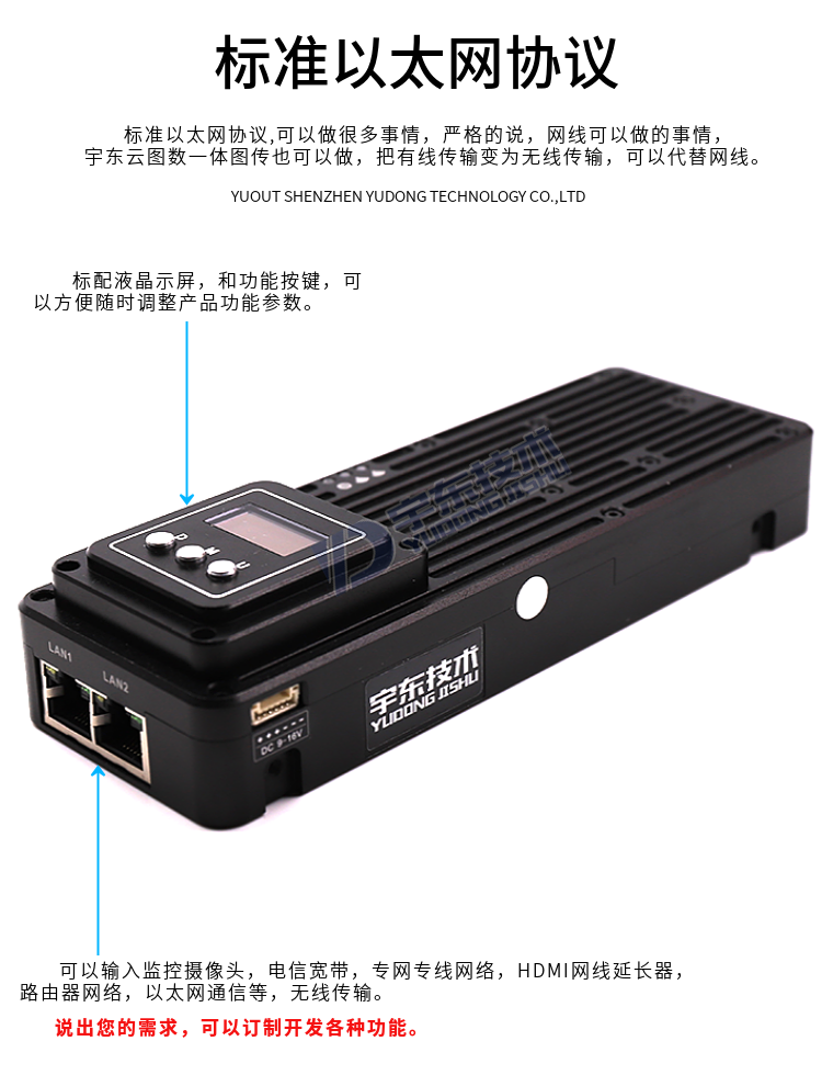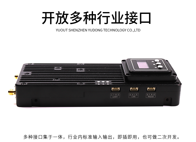 YDTD9000宇東視頻數(shù)據(jù)無線圖傳系統(tǒng)采用工業(yè)級(jí)無線高速率數(shù)據(jù)傳輸技術(shù),非視距,非WIFI,集合正交頻分復(fù)用時(shí)分多址調(diào)制及MIMO多進(jìn)多出容量技術(shù),完全基于IP互聯(lián)網(wǎng)協(xié)議,實(shí)現(xiàn)全雙向透明通道寬帶傳輸。非視距:500-1000米;地面視距:3000-15000米;空對(duì)地:20000米。系統(tǒng)為純硬件連接,即插即用;創(chuàng)新性液晶一體化設(shè)計(jì)、豐富的CAN總線、RS-232、TTL電平接口,更好的用戶角度體驗(yàn)。通道最大支持30Mbps吞吐量,可廣泛應(yīng)用于工業(yè)自動(dòng)化、工業(yè)機(jī)器人、無人機(jī)、視頻監(jiān)控等通信工作。