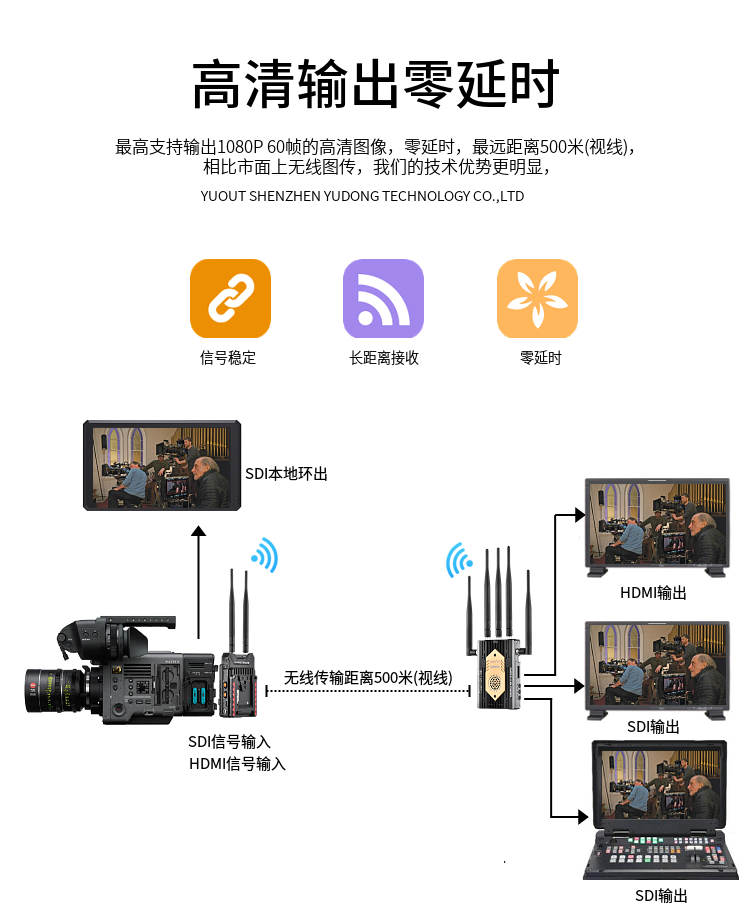 YDS500PRO  It uses broadcast-grade Israeli technology solutions to achieve broadcasting level lossless, no compression, no delay 3G SDI or full HD HDMI signal transmission. This product includes a transmitter and a receiver, and both are equipped with 3G/HD SDI ports and full HD HDMI ports. The transmitter has two antennas and the receiver has five; All antennas operate in the 4.9GHz-5.9GHz frequency range, and the operating frequency of the antenna can be changed through software configuration to adapt to the wireless transmission requirements of different regions of the world. At the same time, on the side of the transmitter and receiver, equipped with a communication channel selection button, you can manually configure 10 different communication channels, very convenient.