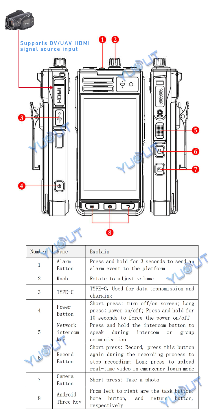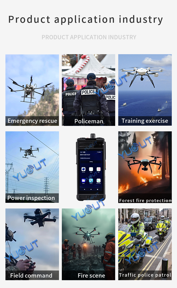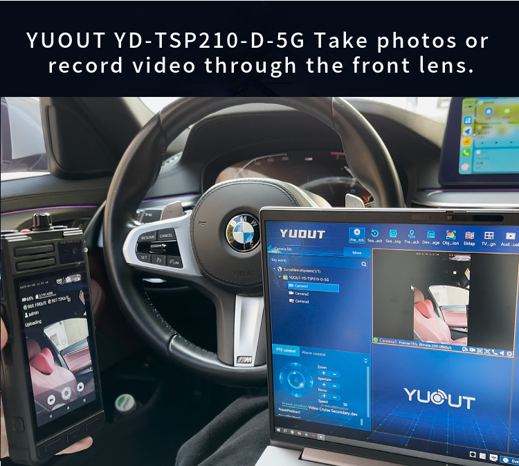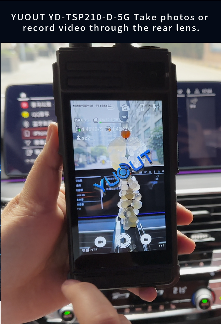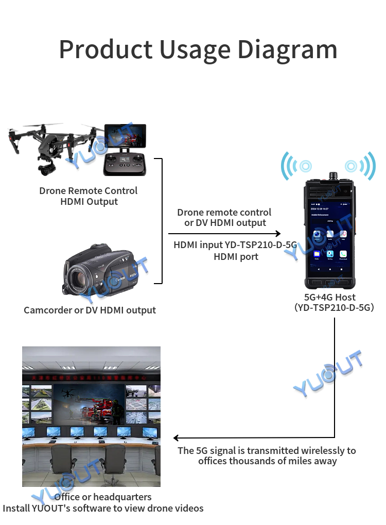 YUOUT YD-TSP210-D-5G is a multi-functional intelligent device with built-in front camera head and rear camera, and supports external HDMI signal source input.  This device supports 5G+4G function, and can remotely view the live video of the staff in other regions or cities in the office/command center (for example, I am now in Shenzhen, China, and can view the re-scene video of the staff in Beijing, China), positioning information and call intercom.  Install mobile SIM card, can also be used as a mobile phone, can make phone calls.  The device is light, easy to carry, and can be hung on the chest and belt.  Mainly used in public security patrol, traffic police, drone remote control HDMI output, DV camera and so on.